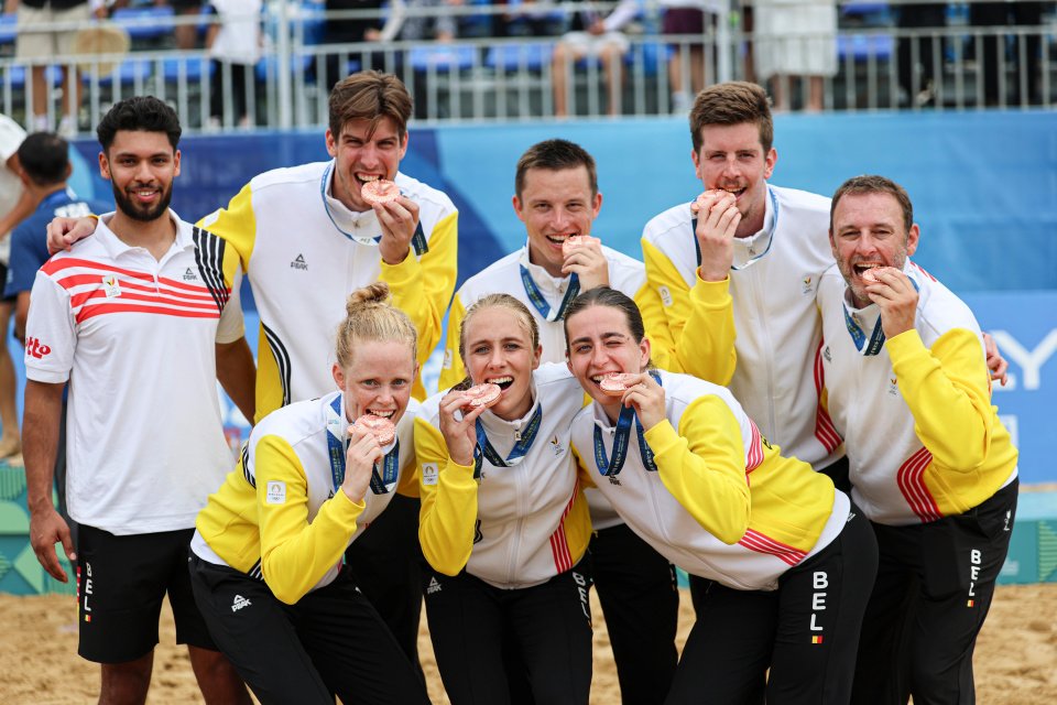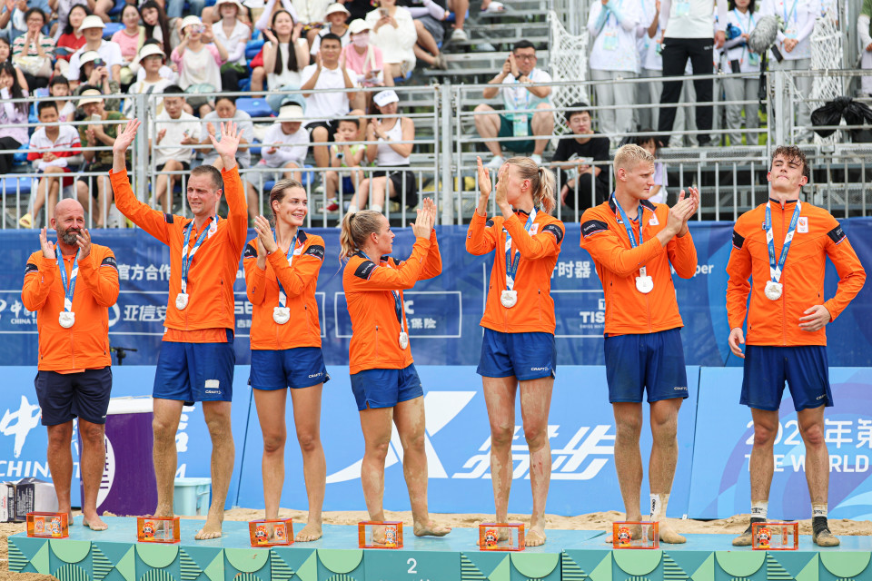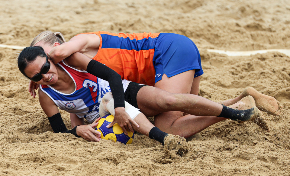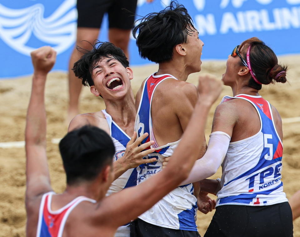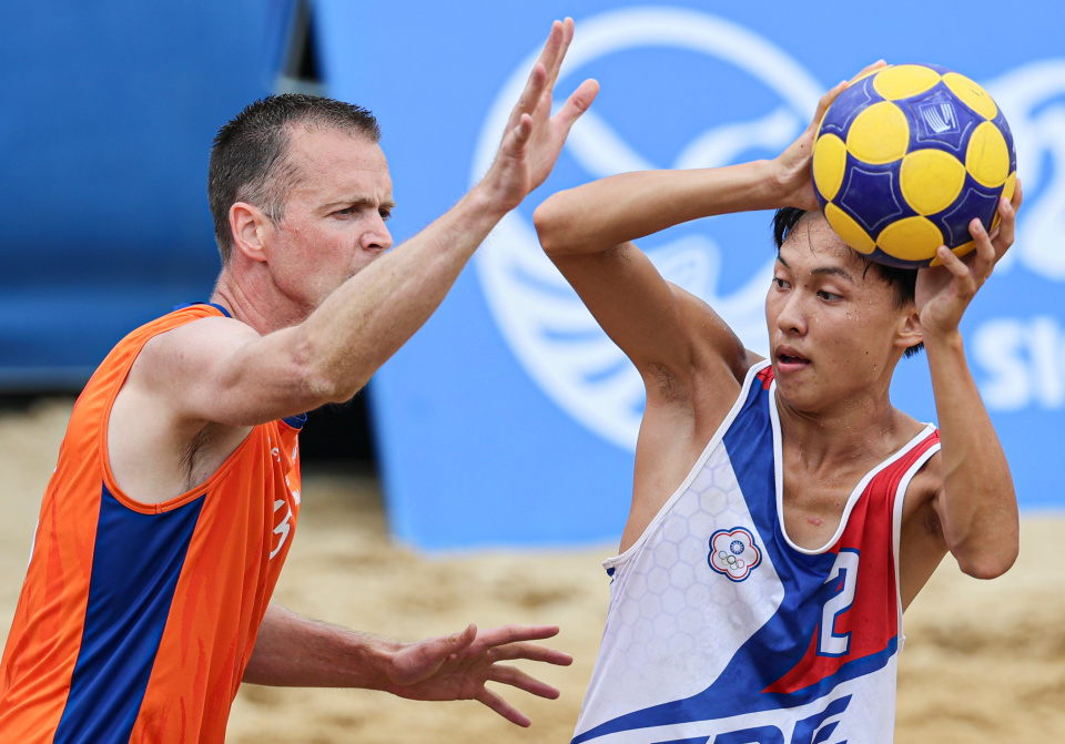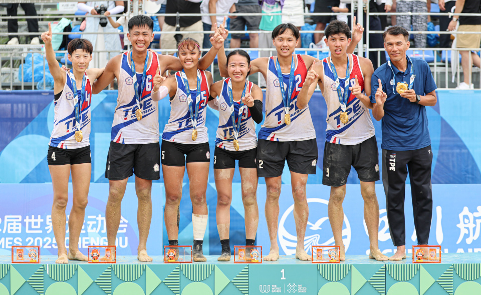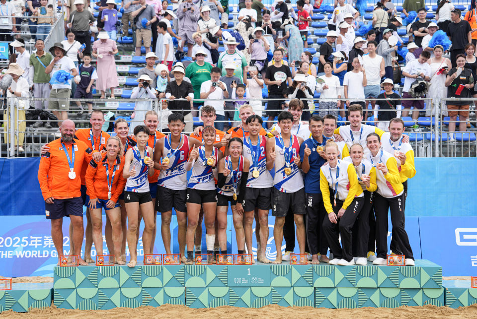 当日,在2025年成都世运会沙滩荷球混合团体赛金牌赛中,中国台北队战胜荷兰队,获得冠军。