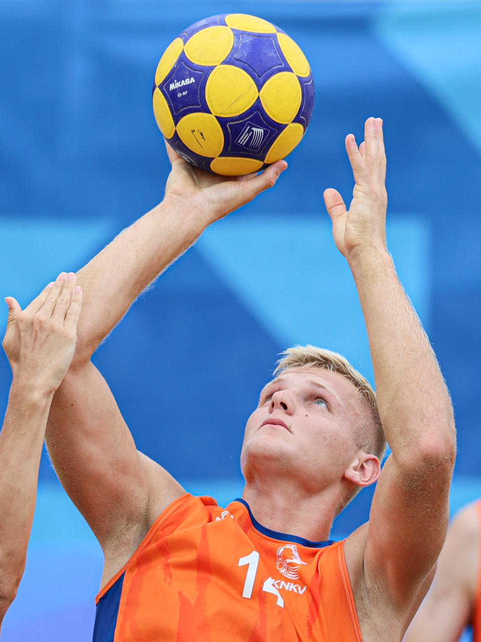 8月17日,荷兰队球员雅斯珀在比赛中投球。新华社记者 刘坤 摄